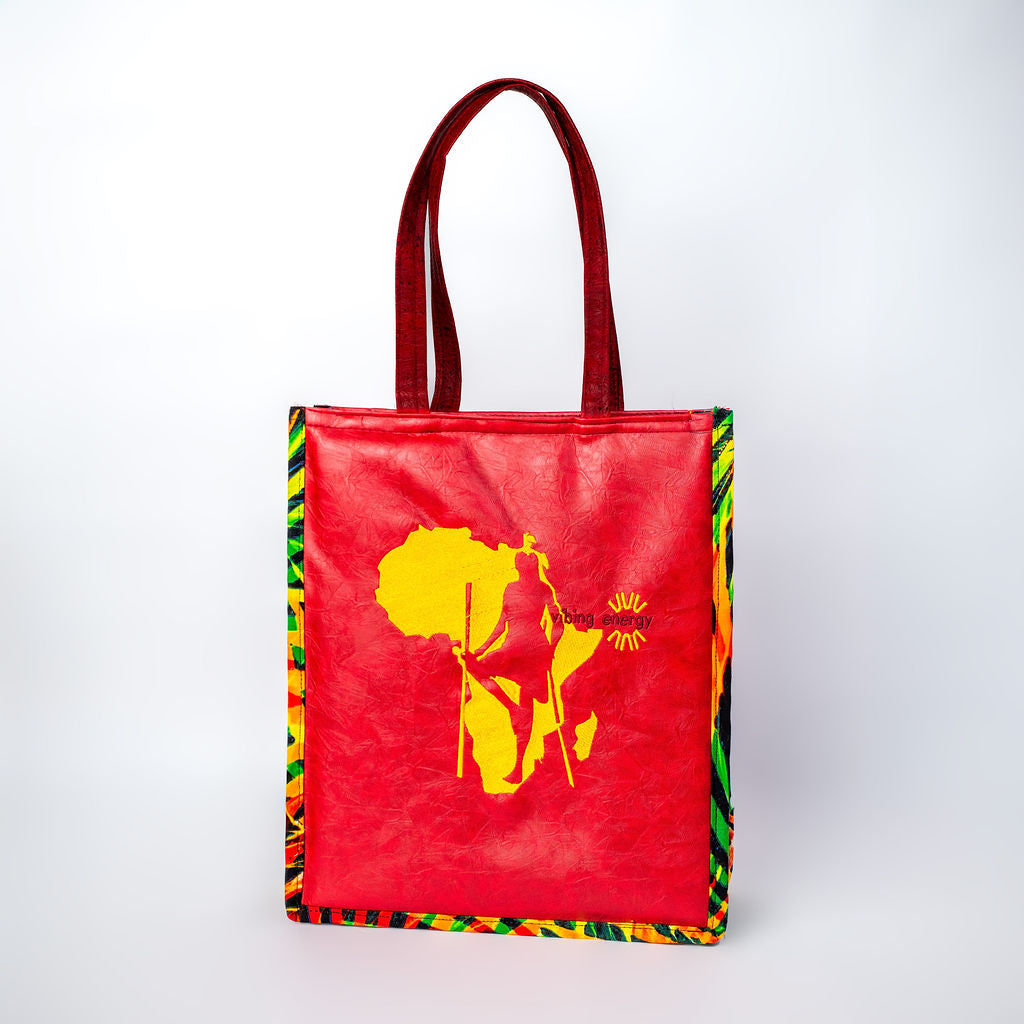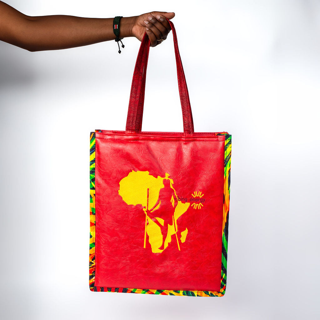 The Shujaa Flame Tote Bag makes a bold statement with its striking red faux leather body and vibrant patterned trim. Featuring a beautifully designed map with a warrior silhouette on the front, this spacious and durable tote embodies strength and style. Perfect for everyday use, work, or travel, it seamlessly blends elegance with practicality.