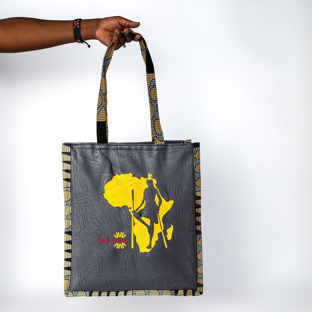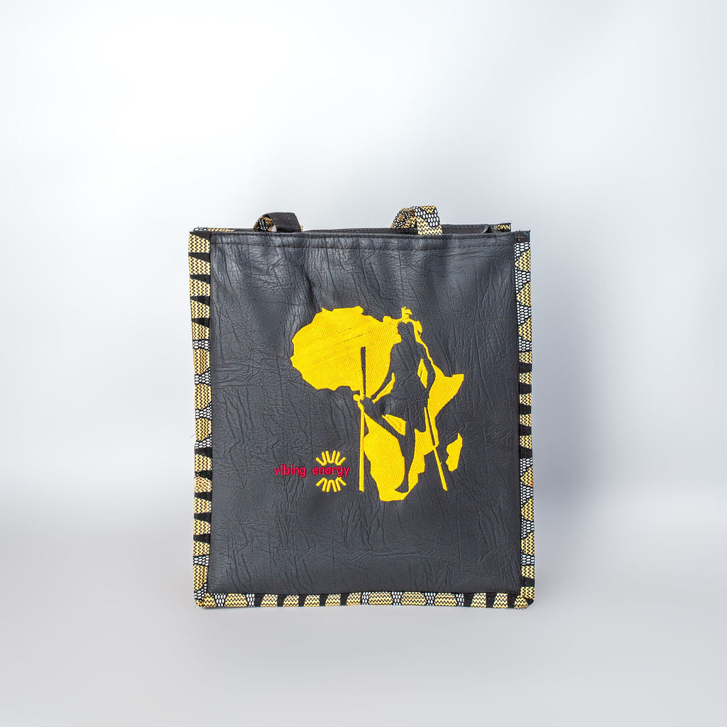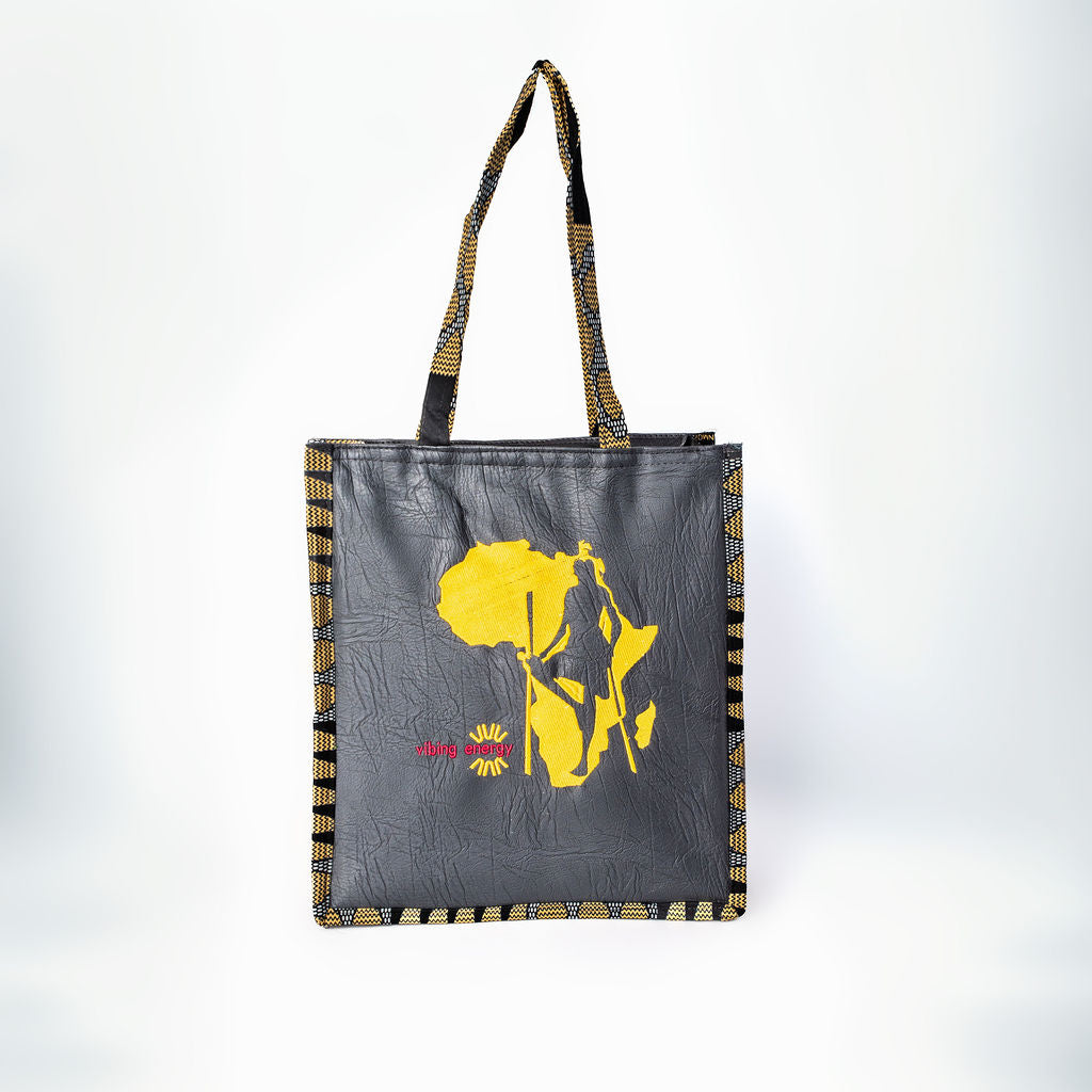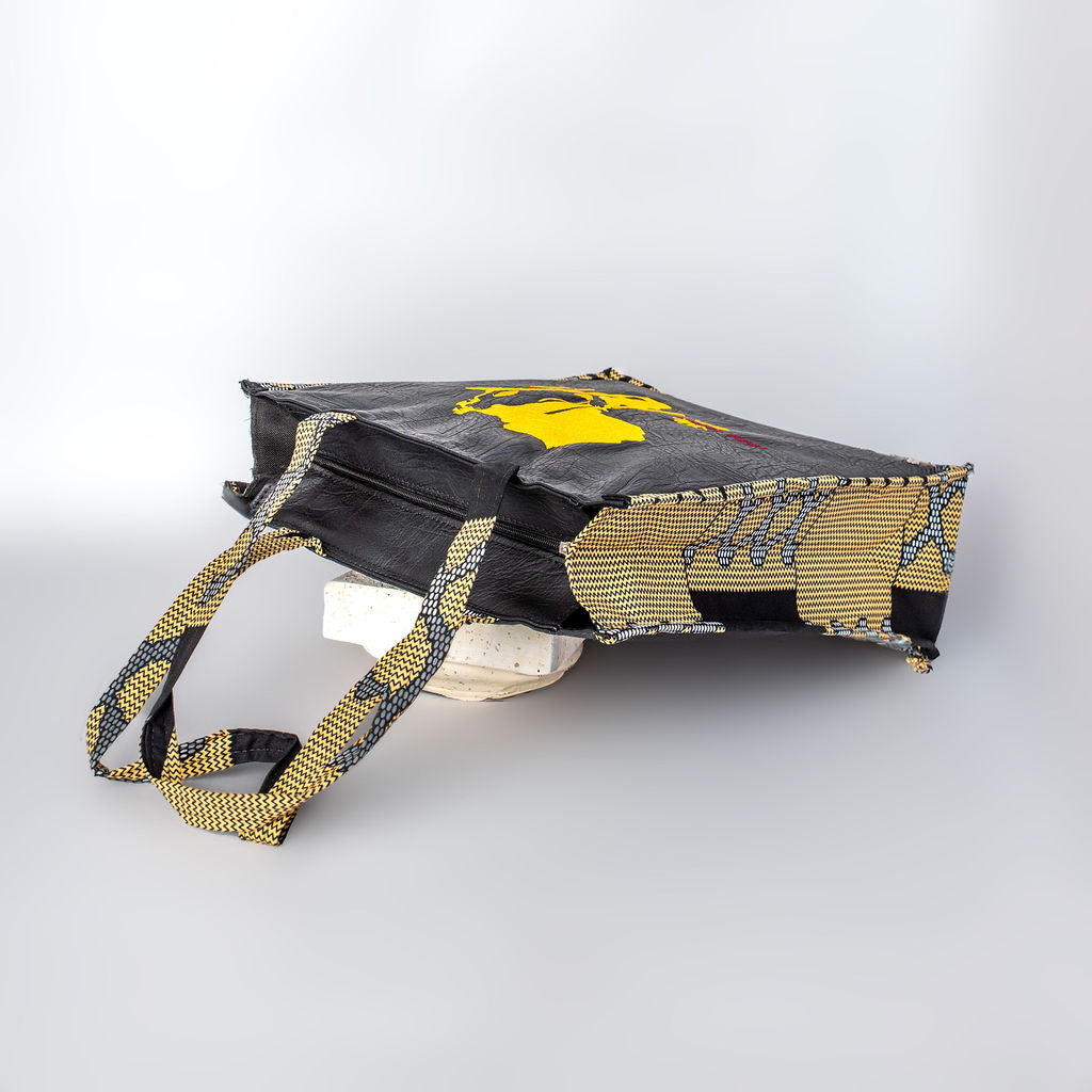 The Shujaa Tote Bag combines heritage with modern elegance. Featuring a vibrant black  faux leather base with striking golden yellow patterned trim, it highlights a powerful warrior silhouette over a continental design. Spacious, stylish, and durable, this tote is perfect for work, travel, or everyday use.