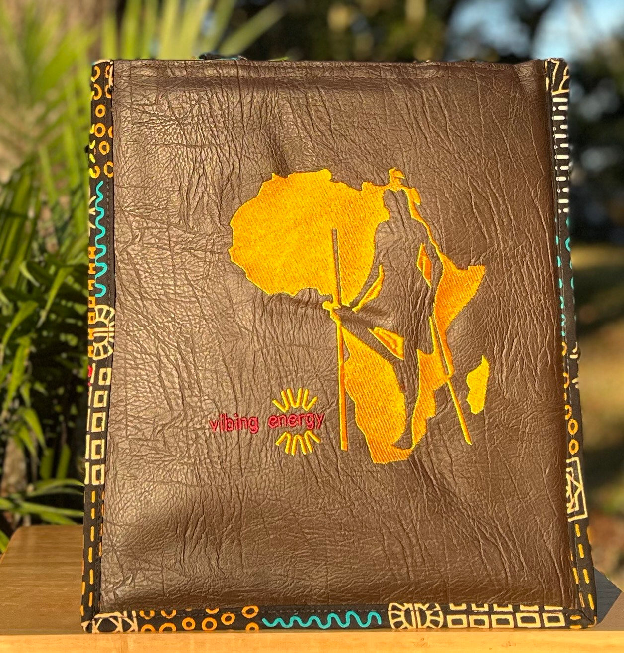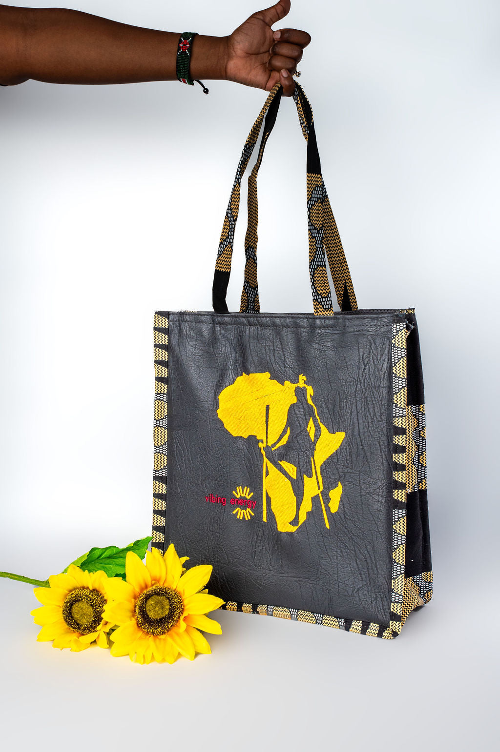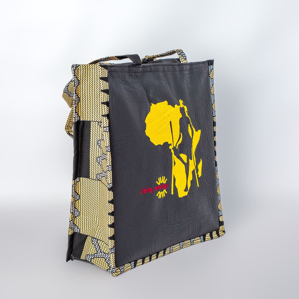 The Shujaa Tote Bag combines heritage with modern elegance. Featuring a vibrant black  faux leather base with striking golden yellow patterned trim, it highlights a powerful warrior silhouette over a continental design. Spacious, stylish, and durable, this tote is perfect for work, travel, or everyday use.